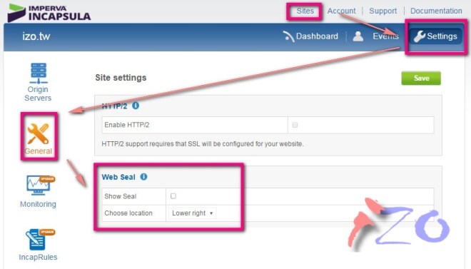 在后臺(tái)> Sites > 選擇該網(wǎng)域> Settings > General > Web Seal 取消勾選,就OK拉!