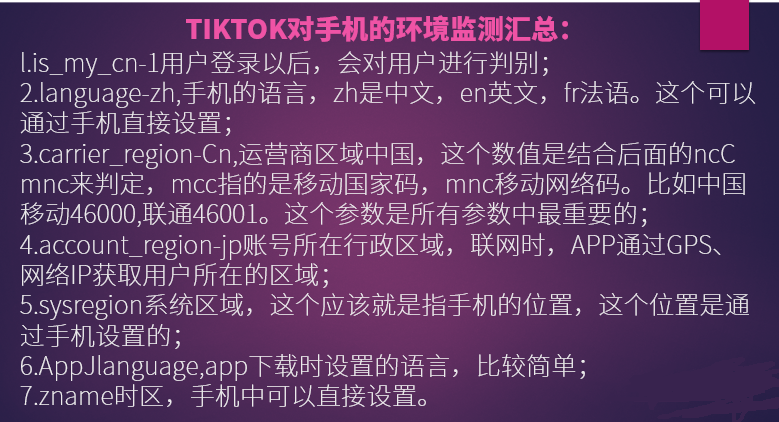 由于種種原因,tiktok是區(qū)隔國內(nèi)網(wǎng)民使用的,怎么區(qū)隔識別呢,下面這張圖就詳細的列舉了tiktok監(jiān)測你手機的各個細項的識別參數(shù)。
